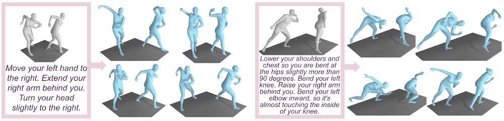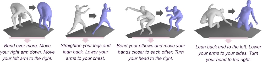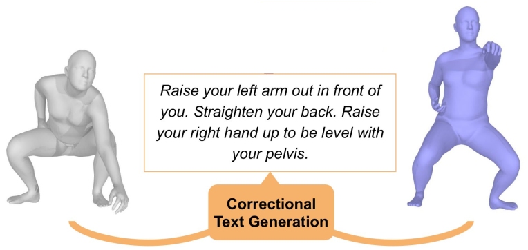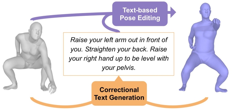 Our work fits several applications. For instance, correctional text generation could be used by a fitness application to help people correct their pose and avoid pain or injury. Modifying texts could be used as auxiliary input to guide pose estimation from images in difficult cases; or as instructions to modify a pose or a pose sequence in digital animation.