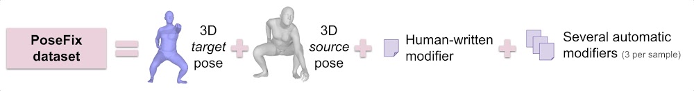 In this work we are interested in linking text to human pose through the following 3 elements: a source pose, a target pose, and a text explaining how to correct the source pose to produce the target pose. For this purpose we first introduce the PoseFix dataset, which contains thousands of such triplets.