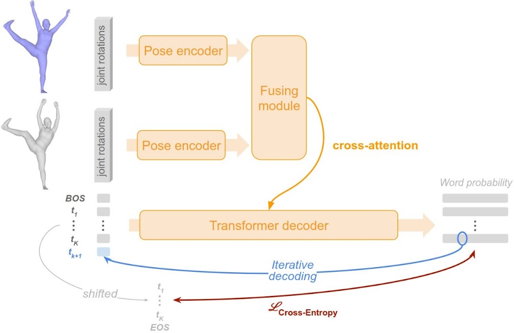 We build on top of a regular auto-regressive text generation model. The poses are encoded using a shared encoder, their embedding are combined thanks to a fusing module, then they are injected by cross-attention in a transformer text decoder.